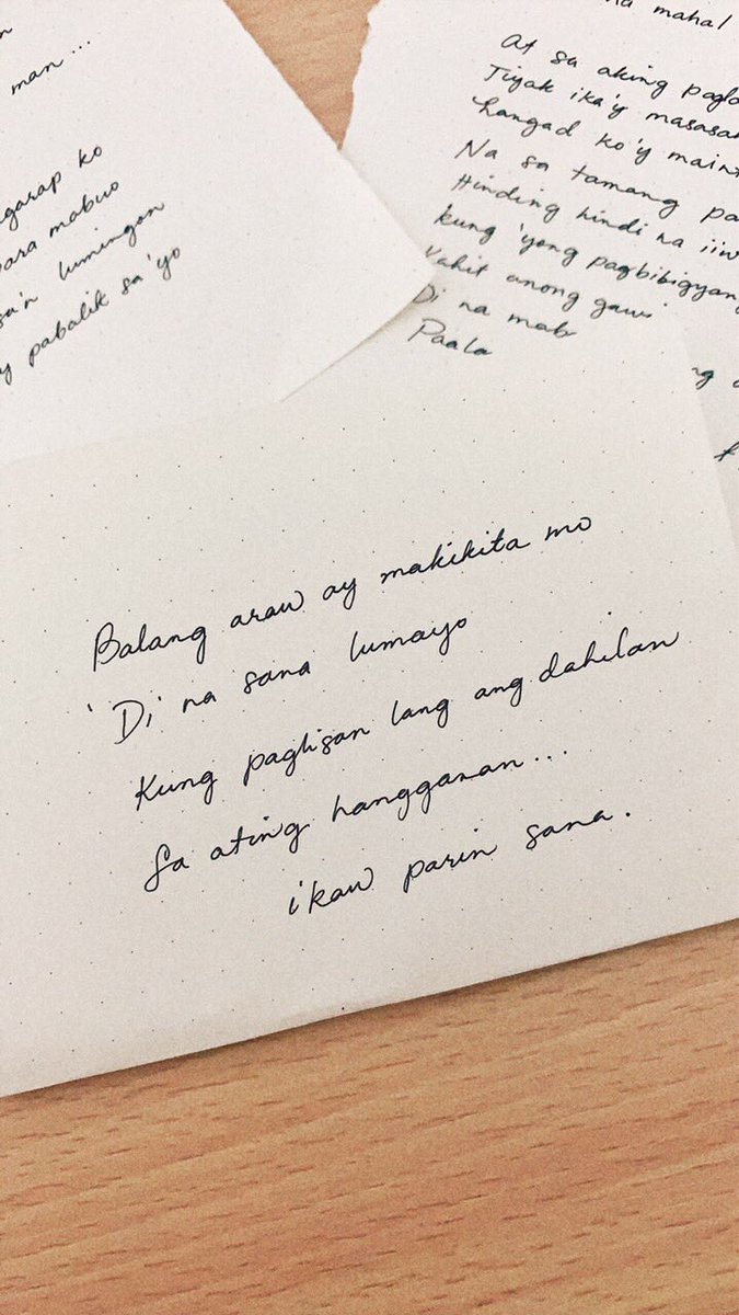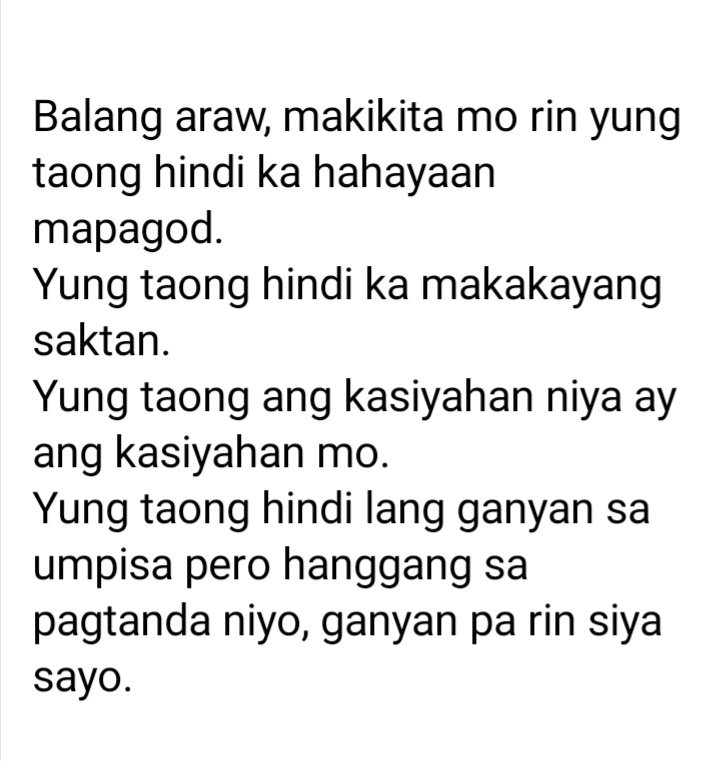 7212017 Mukhang hindi mo na siya nalilimutan cj Tila dala mo pa bunga ng kanyang paglisan At makikita sa mata Ang pagka-wala ng sigla kay grace Mukhang pinipilit mo lang ang ngumiti Na di naman nababakas sa yong labi At di ko na napupuna Ang binibitawan mong tawa Hayaan mo na lang ang pagpatak ng luha Tulad ng ulan na dulot sa tin ay bah At balang araw ay makikita mo Sa pagtila nito ay.