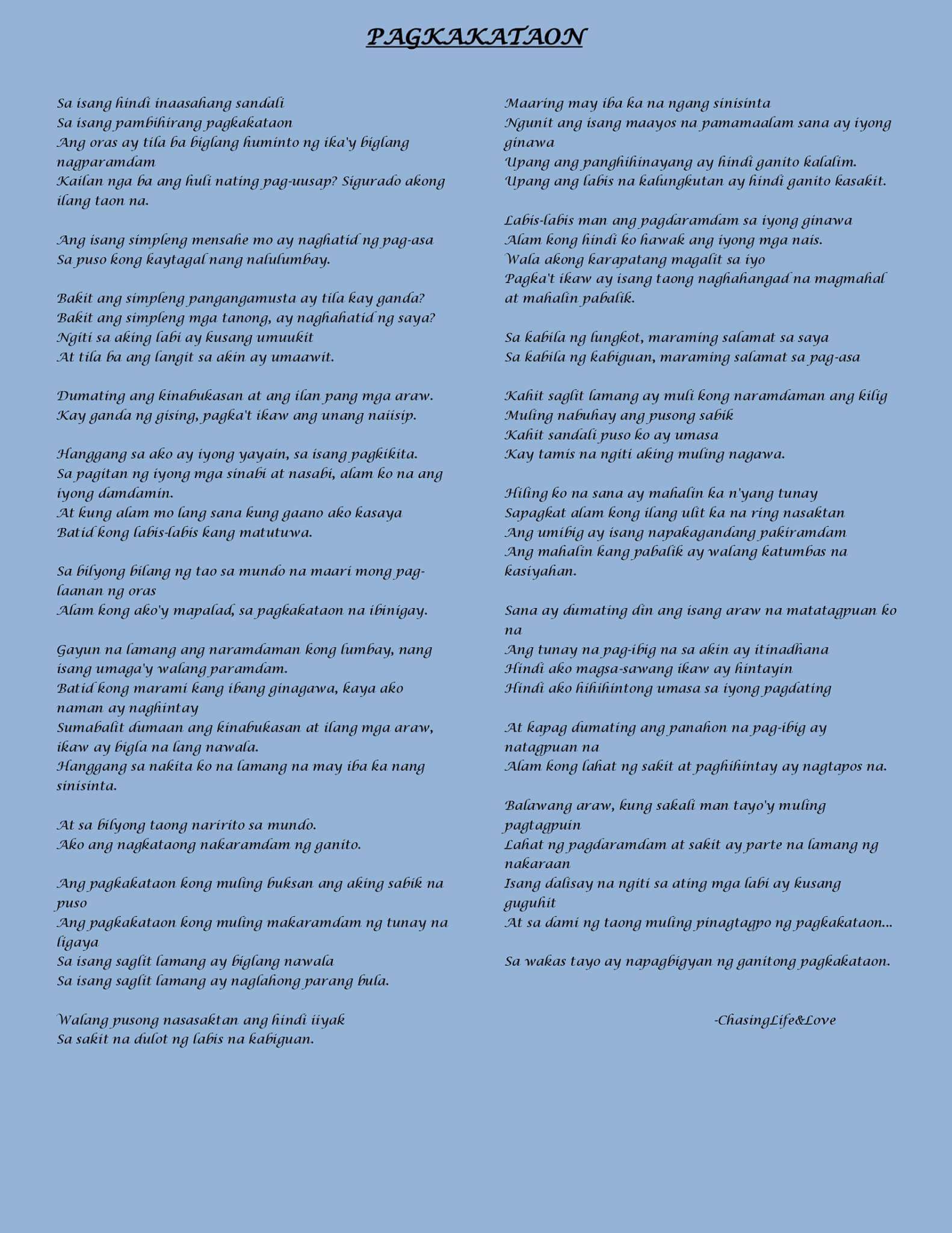 Kapayapaan ay kayganda Pag ang problemay naresolba Ngiti moy muling makikita At mundong itoy liligaya. February 18 2020 0154PM. Oh mahal kong nilalangit Nilalangaw pati puwit.