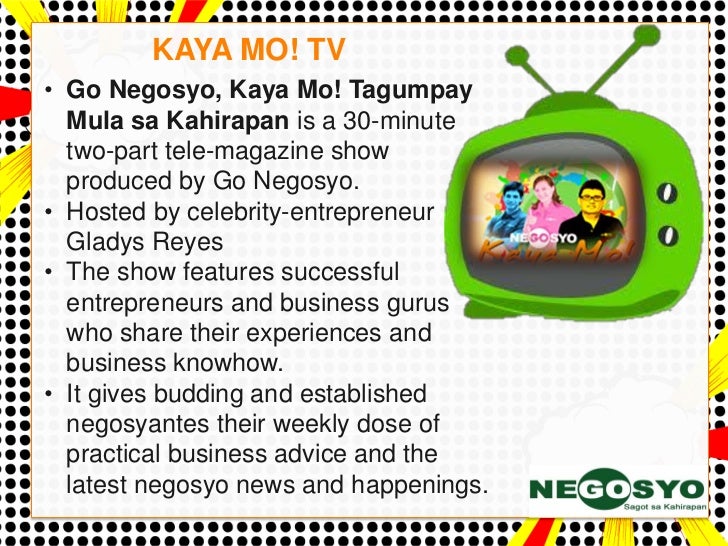 On GMA News TV every Saturday and Sunday at 8-830 am. Go Negosyo Kaya Mo. Go Negosyo applauds Multiply and Rockwell for enabling Filipinos fulfill their entrepreneurial dreams.