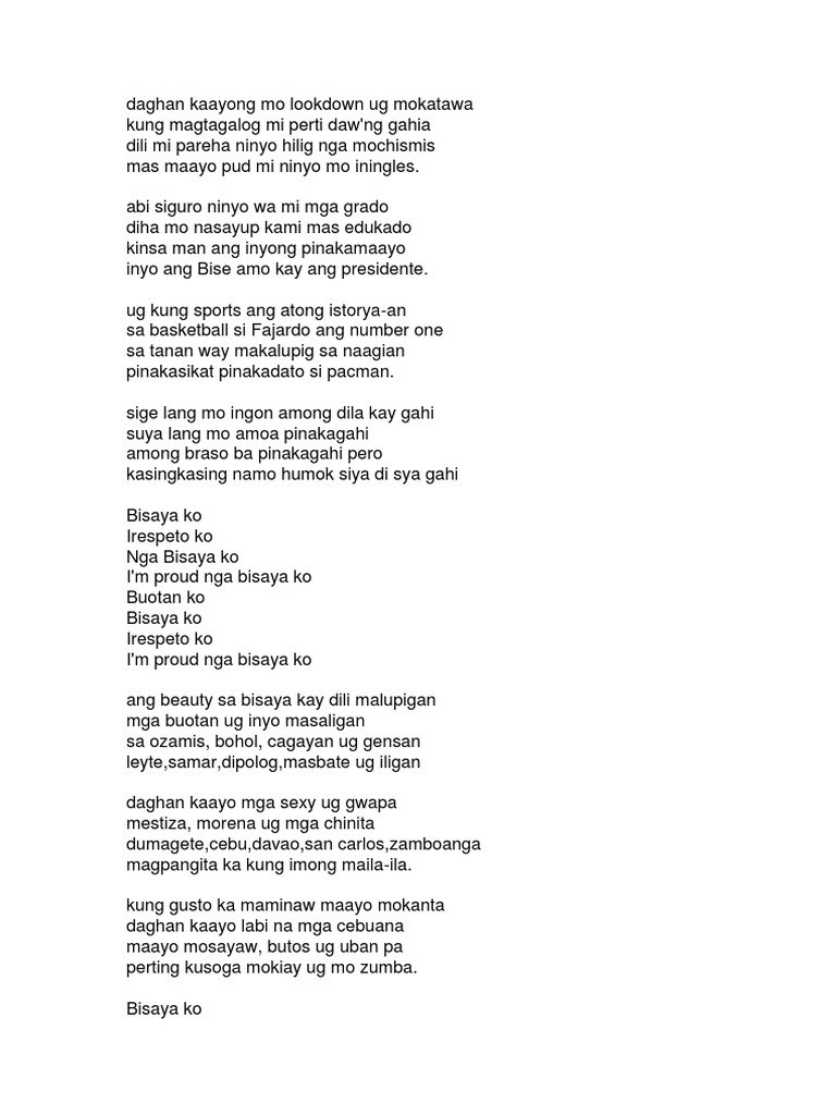11182017 Text mo sa 0943-0766611. 1132020 Verse 4 C Sige lang mo ingon among dila kay gahi G Suya lang mo amoa pinakagahi Am Among braso ba pinakagahi pero F Kasingkasing namo humok siya di sya gahi Chorus C G Am Bisaya ko Irespeto ko F C Nga Bisaya ko Im proud nga bisaya ko C G Am Buotan ko Bisaya ko F C Irespeto ko Im proud nga bisaya ko Verse 5 C Ang beauty sa bisaya kay. TagalogEnglish wag ka mag tipi d para sa tipirin ang sarili mo TagalogEnglish ingnieur routier FrenchGreek versammlungen.