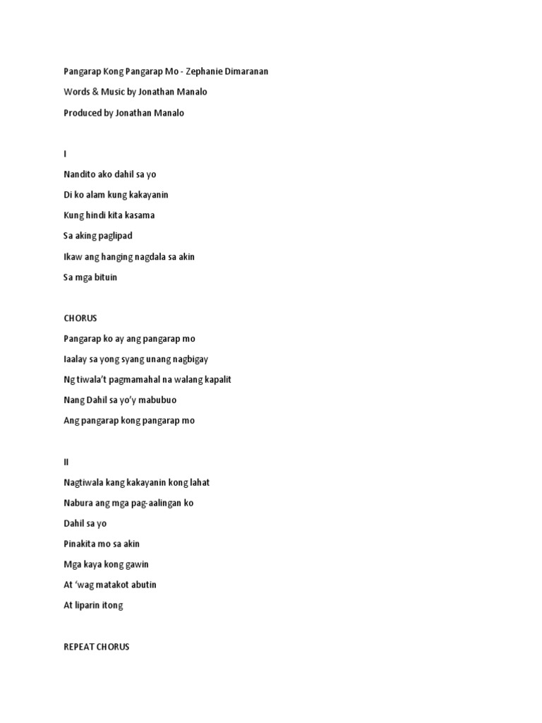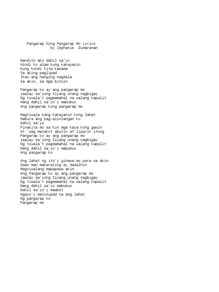 Discover who has written this song. Pangarap Kong Pangarap Mo by Zephanie Pangarap Kong Pangarap Mo. Nandito ako dahil sa yo Di ko alam kung kakayanin Kung hindi kita kasama Sa aking paglipad Ikaw ang hanging nagdala sa akin Sa mga bituin Pangarap ko.