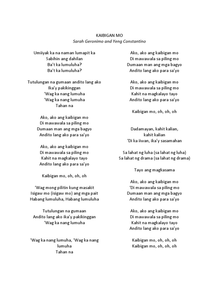 8102017 The Lyrics for Kaibigan Mo by Sarah Geronimo feat. Kaibigan mo Verse 1 C Umiiyak ka na naman C7 Lumapit ka sabihin ang dahilan F Fm Bat ka lumuluha bat ka lumuluha C Tutulungan na gumaan C7 Andito lang ako ikay pakikinggan F Fm Wag ka nang lumuha wag ka nang lumuha Refrain Dm F Tahan na Chorus C Ako ako ang kaibigan mo C7 Di. 262017 Kaibigan Mo Your Friend Umiiyak ka nanaman Youre crying again Lumapit ka sabihin ang dahilan Come close tell me the reason Bat ka lumuluha Why are you crying Bat ka lumuluha Why are you crying.