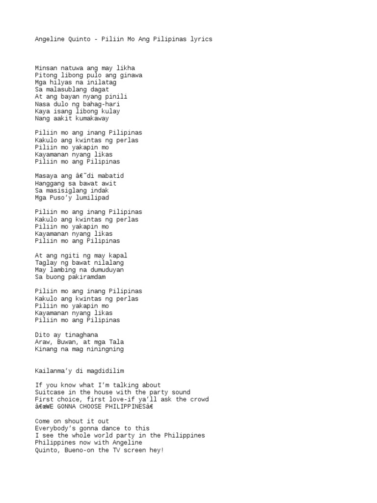 Lyrics to Piliin Mo Ang Pilipinas by Angeline Quinto. 8794 views added to favorites 83 times. Download the song Angeline Quinto - Piliin Mo Ang Pilipinas Lyrics for free and search mp3s you want.