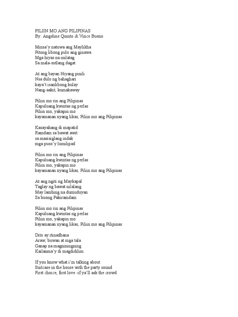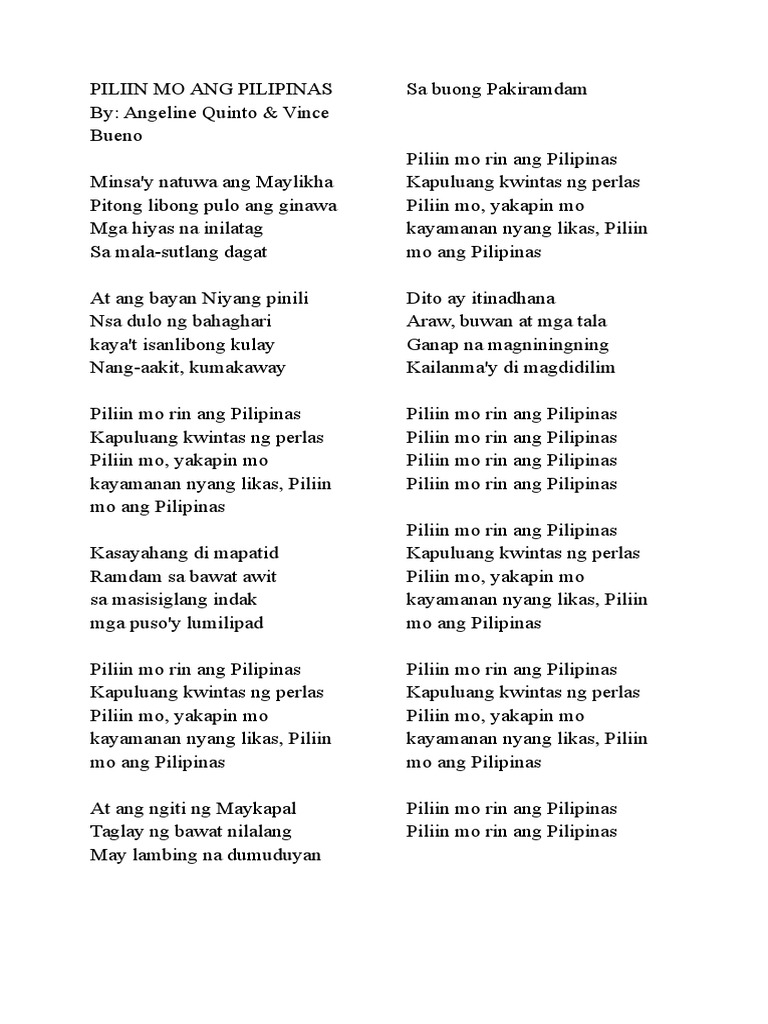 Angeline Quinto Piliin Mo Ang Pilipinas Lyrics اسمع Angeline Quinto Piliin Mo Ang Pilipinas Lyrics موسيقى Angeline Quinto Piliin Mo Ang Pilipinas Lyrics اسمع. Minsan natuwa ang may likha Pitong libong pulo ang ginawa Mga hilyas na inilatag Sa malasublang dagat At ang bayan nyan. Vince Bueno Minsan natuwa ang may likha Pitong libong pulo ang ginawa Mga hilyas na inilatag Sa malasublang dagat At ang bayan nyang pinili Nasa dulo ng bahag-hari Kaya isang libong kulay Nang aakit kumakaway Piliin mo ang inang Pilipinas Kakulo ang kwintas ng perlas Piliin mo yakapin mo Kayamanan nyang likas Piliin mo ang Pilipinas.